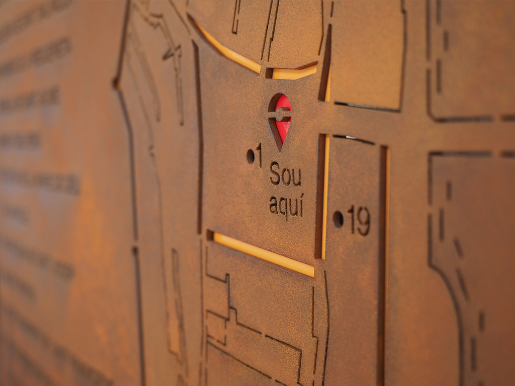 Models disponibles: plaques identificadores murals d’acer Corten o pintat; faristols interpretatius amb suport metàl·lic o de fusta; monòlits commemoratius; senyals direccionals urbans amb suport vertical o adossades; tòtems informatius; sistemes modulars per a centres històrics.