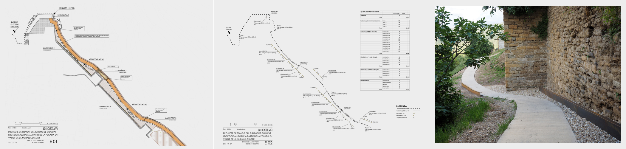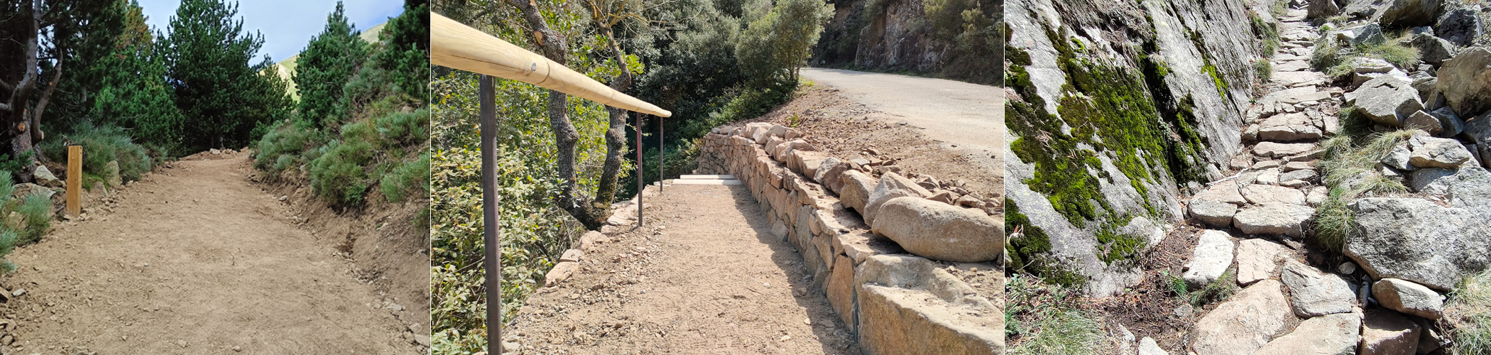 Redacció i execució de projectes d’arranjament de camins, incloent-hi desbrossament, anivellament, drenatges, passos d’aigua, reconstrucció d’elements de pedra seca com ara marges i empedrats, graons i esglaons de fusta i pedra, elements de seguretat com ara cables i clavilles.